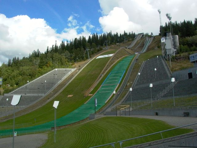Von hier hat man eine schöne Aussicht auf Lillehammer und die Mjosa. Auf der kleineren Schanze, die mit Spezialbelag