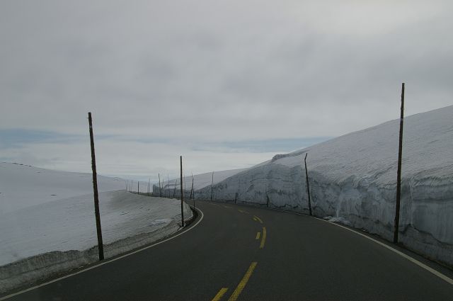 In Geilo bogen wir auf die [7] ab und kamen über den Gebirgspass Hardangervidda. Die Schneewände türmten sich