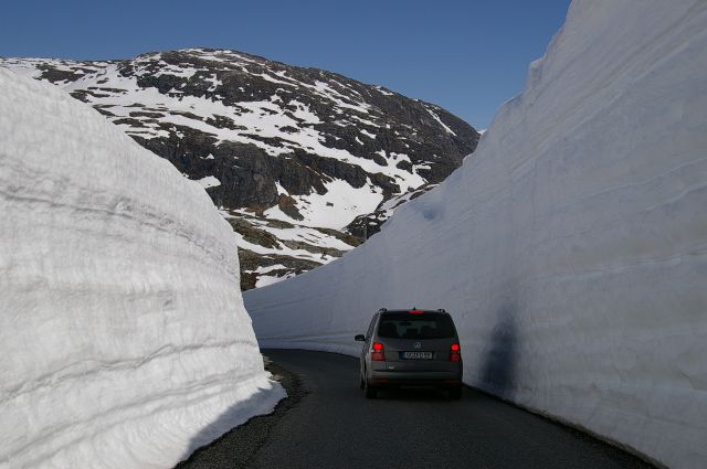 Die enge Straße schlängelte sich durch hohe Schneewände. Oben angekommen hat man einen guten Blick auf die Hardangergegend.